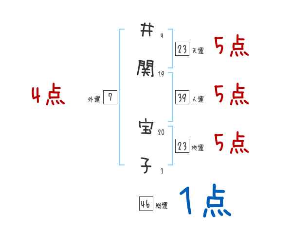 天運![]() | 井関宝子さんの天運は23画の5つ星!想像力に優れ活力がある。一代で成功し名誉を手に入れる。 家系が持つ宿命的な運勢を表します。祖先から受け継いだ苗字ですので自分の力が及びません。家柄を象徴します。 |