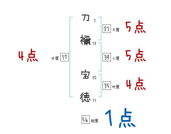 外運![]() | 刀禰宝徳さんの外運は17画の4つ星!積極的な行動力。地位を気づき財産を手に入れる。純粋な心と直感力。 生活面を象徴する運勢です。外部から受ける影響力を表し、結婚運、家庭運や職場、環境への順応性を表します。 |