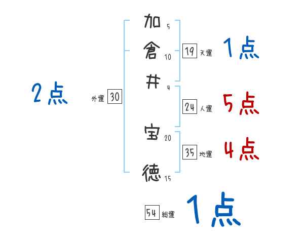 総運![]() | 加倉井宝徳さんの総運は54画の1つ星!トラブルが多いかも。周りをよく見て協調して過ごしましょう。 あなたの人生を表す1番重要な運勢です。生涯を通じて影響する総合運となり、主に50歳以降の晩年期に影響を及ぼします。 |