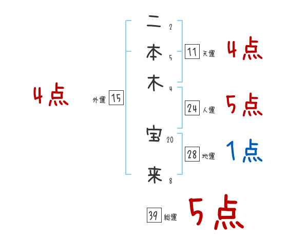 総運![]() | 二本木宝来さんの総運は39画の5つ星!社交性に優れ人望が厚い。人の上に立ち成功する。 あなたの人生を表す1番重要な運勢です。生涯を通じて影響する総合運となり、主に50歳以降の晩年期に影響を及ぼします。 |