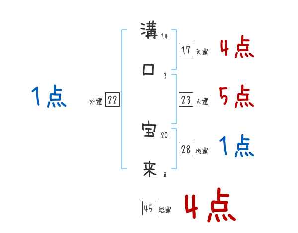 人運![]() | 溝口宝来さんの人運は23画の5つ星!想像力に優れ活力がある。一代で成功し名誉を手に入れる。 性格や才能などを表す2番目に重要な運勢です。人間関係や協調性、社会的な成功に影響します。主に20歳から50歳ぐらいまでの中年期の運勢を表します。 |