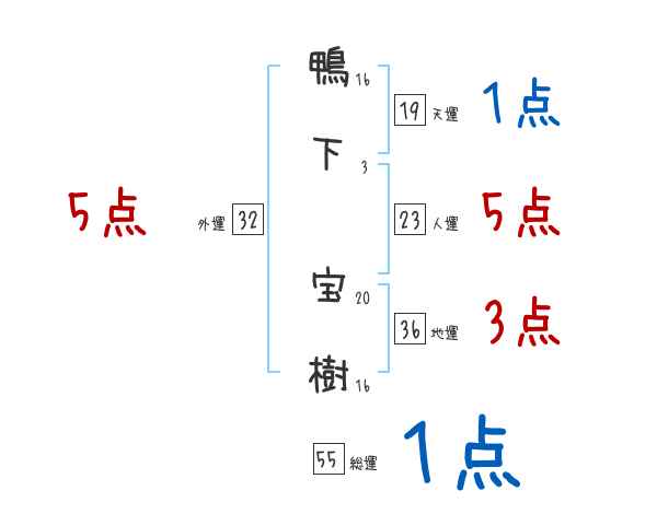 外運![]() | 鴨下宝樹さんの外運は32画の5つ星!柔軟性があり成功する。チャンスが多く金運が良い。 生活面を象徴する運勢です。外部から受ける影響力を表し、結婚運、家庭運や職場、環境への順応性を表します。 |