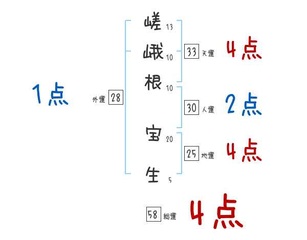 総運![]() | 嵯峨根宝生さんの総運は58画の4つ星!安定した生活。大器晩成タイプ。 あなたの人生を表す1番重要な運勢です。生涯を通じて影響する総合運となり、主に50歳以降の晩年期に影響を及ぼします。 |