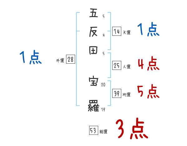 総運![]() | 五反田宝羅さんの総運は53画の3つ星!やや見栄っ張りで虚栄心がある。散財に注意。 あなたの人生を表す1番重要な運勢です。生涯を通じて影響する総合運となり、主に50歳以降の晩年期に影響を及ぼします。 |