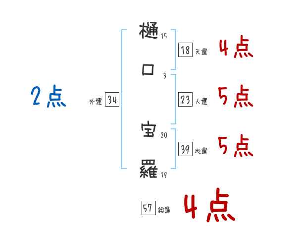 天運![]() | 樋口宝羅さんの天運は18画の4つ星!情熱的で剛気。忍耐力があり信頼される。 家系が持つ宿命的な運勢を表します。祖先から受け継いだ苗字ですので自分の力が及びません。家柄を象徴します。 |