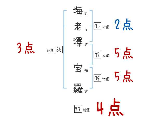 外運![]() | 海老澤宝羅さんの外運は36画の3つ星!先見性が豊かです。多少神経質で苦労することも。 生活面を象徴する運勢です。外部から受ける影響力を表し、結婚運、家庭運や職場、環境への順応性を表します。 |
