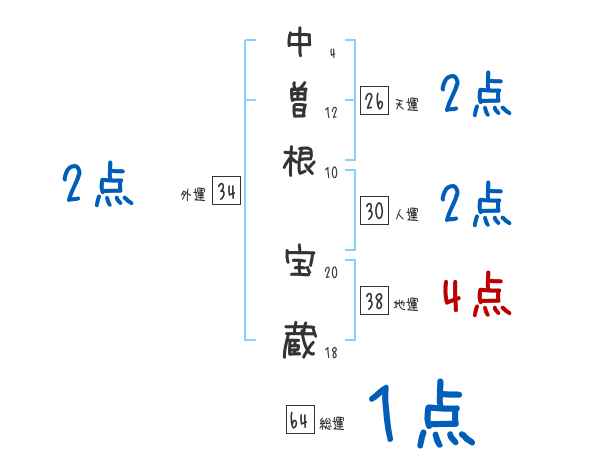 外運![]() | 中曽根宝蔵さんの外運は34画の2つ星!独創性に優れるが、自尊心が強く災難に注意しましょう。 生活面を象徴する運勢です。外部から受ける影響力を表し、結婚運、家庭運や職場、環境への順応性を表します。 |