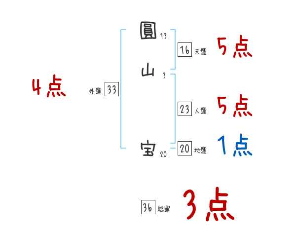 天運![]() | 圓山宝さんの天運は16画の5つ星!人望が厚く大きく発展する。逆転成功が見える。 家系が持つ宿命的な運勢を表します。祖先から受け継いだ苗字ですので自分の力が及びません。家柄を象徴します。 |