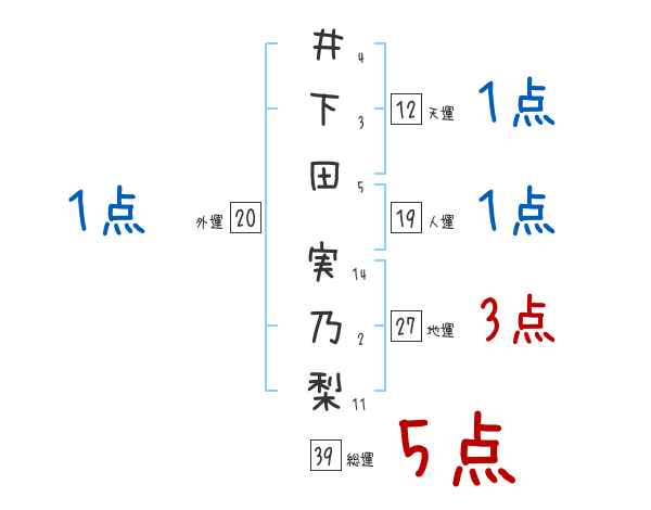 天運![]() | 井下田実乃梨さんの天運は12画の1つ星!簡単な失敗で諦めてしまいやすいかも。着実に行動すると良いでしょう。 家系が持つ宿命的な運勢を表します。祖先から受け継いだ苗字ですので自分の力が及びません。家柄を象徴します。 |