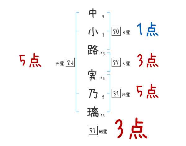外運![]() | 中小路実乃璃さんの外運は24画の5つ星!家庭運が良く順調な人生。金運にも恵まれる。 生活面を象徴する運勢です。外部から受ける影響力を表し、結婚運、家庭運や職場、環境への順応性を表します。 |