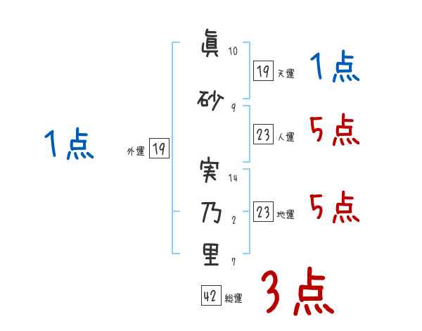 外運![]() | 眞砂実乃里さんの外運は19画の1つ星!優れた才能を持ちますが、協調性が足りないことも。周りの人と協力する事を意識しましょう。 生活面を象徴する運勢です。外部から受ける影響力を表し、結婚運、家庭運や職場、環境への順応性を表します。 |