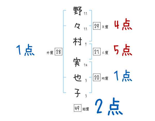 天運![]() | 野々村実也子さんの天運は29画の4つ星!完全主義で才能がある。厳格な心の持ち主。 家系が持つ宿命的な運勢を表します。祖先から受け継いだ苗字ですので自分の力が及びません。家柄を象徴します。 |