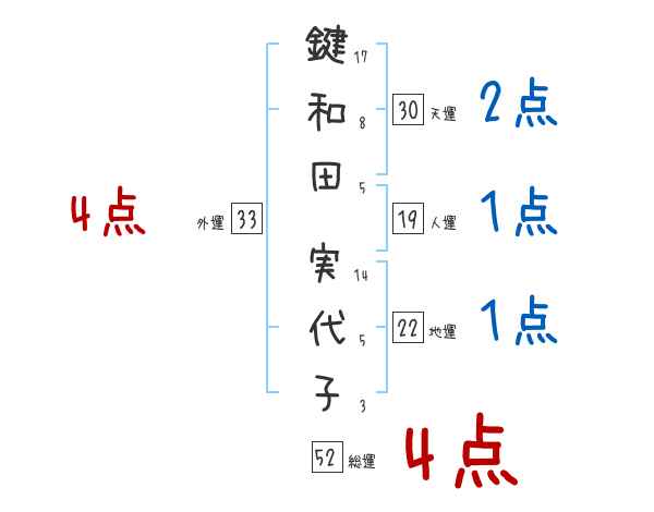 天運![]() | 鍵和田実代子さんの天運は30画の2つ星!浮き沈みの激しさに注意しましょう。 家系が持つ宿命的な運勢を表します。祖先から受け継いだ苗字ですので自分の力が及びません。家柄を象徴します。 |