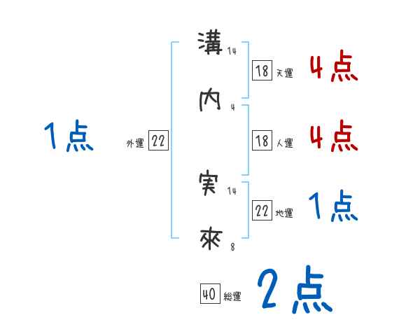 天運![]() | 溝内実來さんの天運は18画の4つ星!情熱的で剛気。忍耐力があり信頼される。 家系が持つ宿命的な運勢を表します。祖先から受け継いだ苗字ですので自分の力が及びません。家柄を象徴します。 |