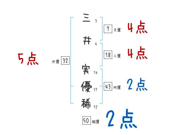外運![]() | 三井実優稀さんの外運は32画の5つ星!柔軟性があり成功する。チャンスが多く金運が良い。 生活面を象徴する運勢です。外部から受ける影響力を表し、結婚運、家庭運や職場、環境への順応性を表します。 |