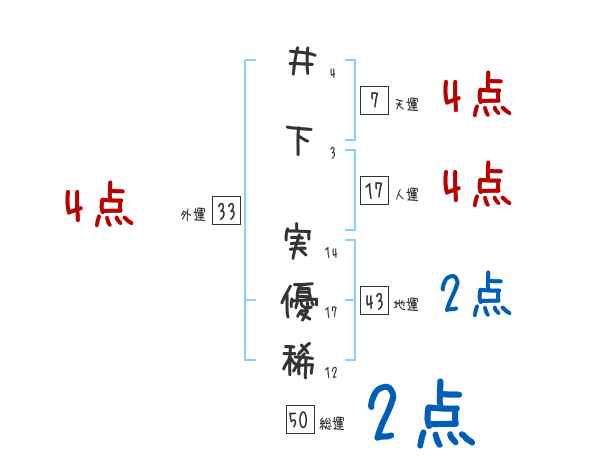 外運![]() | 井下実優稀さんの外運は33画の4つ星!権力志向でプライドが高い。勇気があり運を切り開き成功する。 生活面を象徴する運勢です。外部から受ける影響力を表し、結婚運、家庭運や職場、環境への順応性を表します。 |