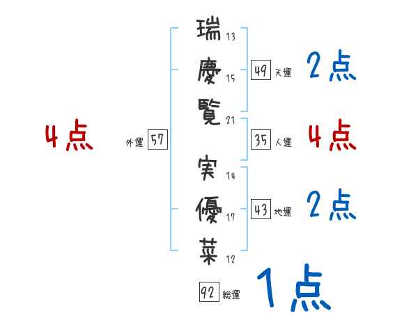 外運![]() | 瑞慶覧実優菜さんの外運は57画の4つ星!向上心があり人望がある。地位を得る。 生活面を象徴する運勢です。外部から受ける影響力を表し、結婚運、家庭運や職場、環境への順応性を表します。 |