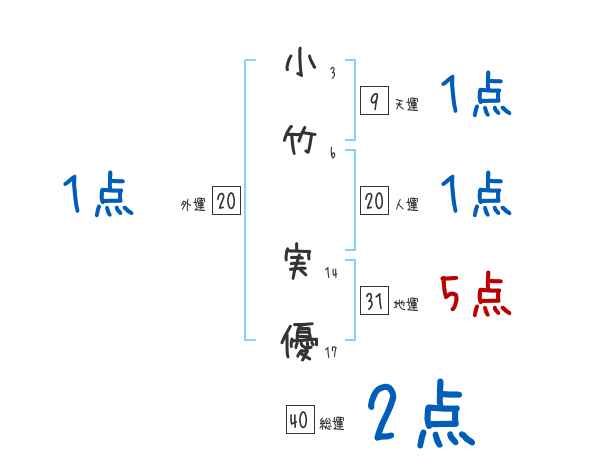 外運![]() | 小竹実優さんの外運は20画の1つ星!社交が苦手。人とは違った才能があり波乱万丈な人生かも。 生活面を象徴する運勢です。外部から受ける影響力を表し、結婚運、家庭運や職場、環境への順応性を表します。 |