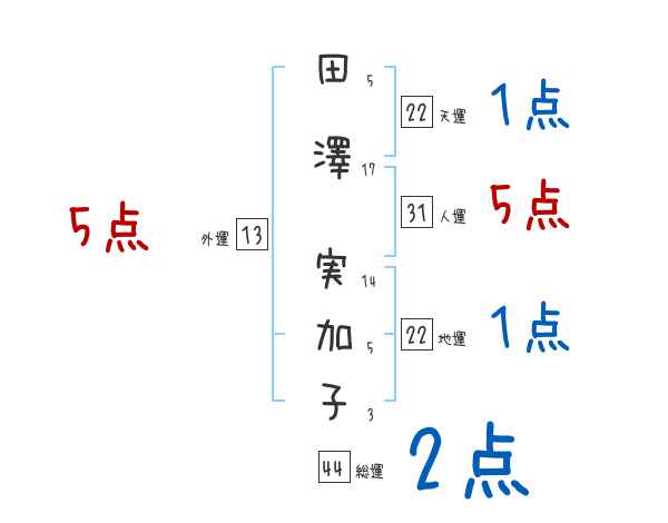 天運![]() | 田澤実加子さんの天運は22画の1つ星!努力することが苦手ないっぽう手先が器用。芸術性にも優れる。 家系が持つ宿命的な運勢を表します。祖先から受け継いだ苗字ですので自分の力が及びません。家柄を象徴します。 |