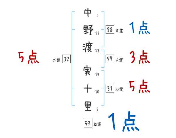 外運![]() | 中野渡実十里さんの外運は32画の5つ星!柔軟性があり成功する。チャンスが多く金運が良い。 生活面を象徴する運勢です。外部から受ける影響力を表し、結婚運、家庭運や職場、環境への順応性を表します。 |