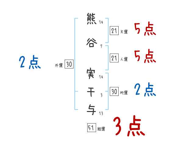 天運![]() | 熊谷実千与さんの天運は21画の5つ星!統率力がある。独立し成功する。名誉を手に入れる。 家系が持つ宿命的な運勢を表します。祖先から受け継いだ苗字ですので自分の力が及びません。家柄を象徴します。 |