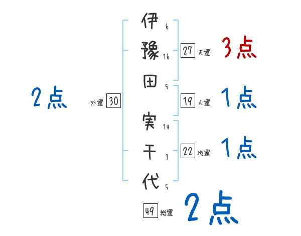 人運![]() | 伊豫田実千代さんの人運は19画の1つ星!優れた才能を持ちますが、協調性が足りないことも。周りの人と協力する事を意識しましょう。 性格や才能などを表す2番目に重要な運勢です。人間関係や協調性、社会的な成功に影響します。主に20歳から50歳ぐらいまでの中年期の運勢を表します。 |