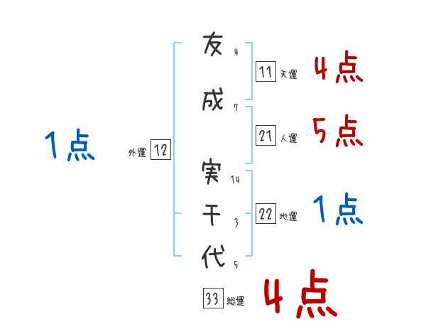 天運![]() | 友成実千代さんの天運は11画の4つ星!着実に富や地位を得る幸運な人生。 家系が持つ宿命的な運勢を表します。祖先から受け継いだ苗字ですので自分の力が及びません。家柄を象徴します。 |