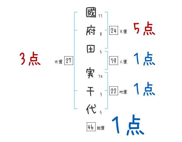 天運![]() | 國府田実千代さんの天運は24画の5つ星!家庭運が良く順調な人生。金運にも恵まれる。 家系が持つ宿命的な運勢を表します。祖先から受け継いだ苗字ですので自分の力が及びません。家柄を象徴します。 |