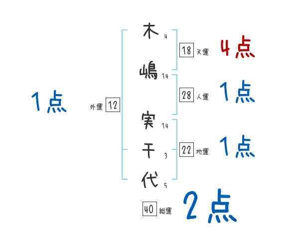 天運![]() | 木嶋実千代さんの天運は18画の4つ星!情熱的で剛気。忍耐力があり信頼される。 家系が持つ宿命的な運勢を表します。祖先から受け継いだ苗字ですので自分の力が及びません。家柄を象徴します。 |