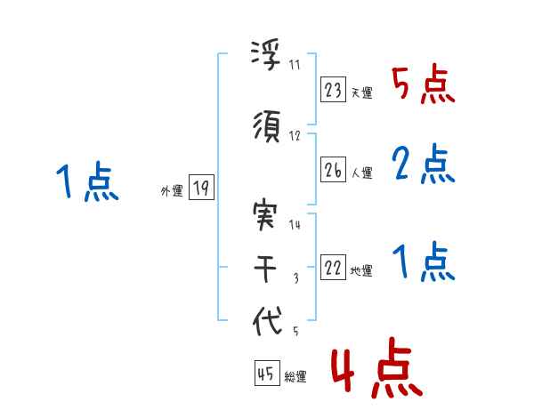 外運![]() | 浮須実千代さんの外運は19画の1つ星!優れた才能を持ちますが、協調性が足りないことも。周りの人と協力する事を意識しましょう。 生活面を象徴する運勢です。外部から受ける影響力を表し、結婚運、家庭運や職場、環境への順応性を表します。 |