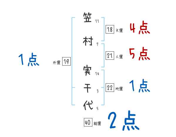 天運![]() | 笠村実千代さんの天運は18画の4つ星!情熱的で剛気。忍耐力があり信頼される。 家系が持つ宿命的な運勢を表します。祖先から受け継いだ苗字ですので自分の力が及びません。家柄を象徴します。 |