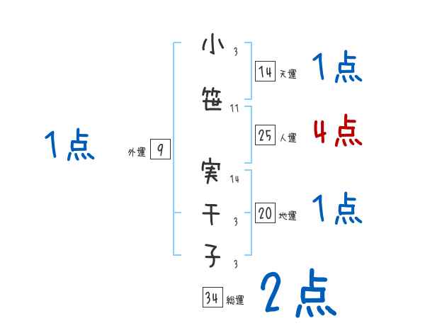 外運![]() | 小笹実千子さんの外運は9画の1つ星!消極的で才能を発揮することが苦手なことも。周りの意見に耳を傾けましょう。 生活面を象徴する運勢です。外部から受ける影響力を表し、結婚運、家庭運や職場、環境への順応性を表します。 |