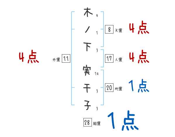 天運![]() | 木ノ下実千子さんの天運は8画の4つ星!勤勉家。根気強く努力し成功する。忍耐力がある。 家系が持つ宿命的な運勢を表します。祖先から受け継いだ苗字ですので自分の力が及びません。家柄を象徴します。 |