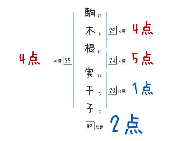 天運![]() | 駒木根実千子さんの天運は29画の4つ星!完全主義で才能がある。厳格な心の持ち主。 家系が持つ宿命的な運勢を表します。祖先から受け継いだ苗字ですので自分の力が及びません。家柄を象徴します。 |
