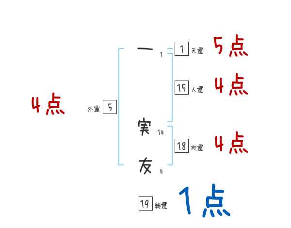 天運![]() | 一実友さんの天運は1画の5つ星!行動力、指導力があり出世し繁栄する。幸運に恵まれる。 家系が持つ宿命的な運勢を表します。祖先から受け継いだ苗字ですので自分の力が及びません。家柄を象徴します。 |