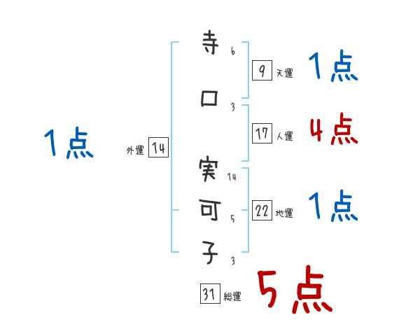 外運![]() | 寺口実可子さんの外運は14画の1つ星!人に対して優しいがストレスを溜め込みがち。人間関係のトラブルを避けるよう気をつけましょう。 生活面を象徴する運勢です。外部から受ける影響力を表し、結婚運、家庭運や職場、環境への順応性を表します。 |