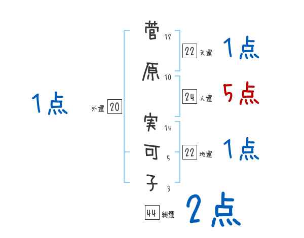 天運![]() | 菅原実可子さんの天運は22画の1つ星!努力することが苦手ないっぽう手先が器用。芸術性にも優れる。 家系が持つ宿命的な運勢を表します。祖先から受け継いだ苗字ですので自分の力が及びません。家柄を象徴します。 |