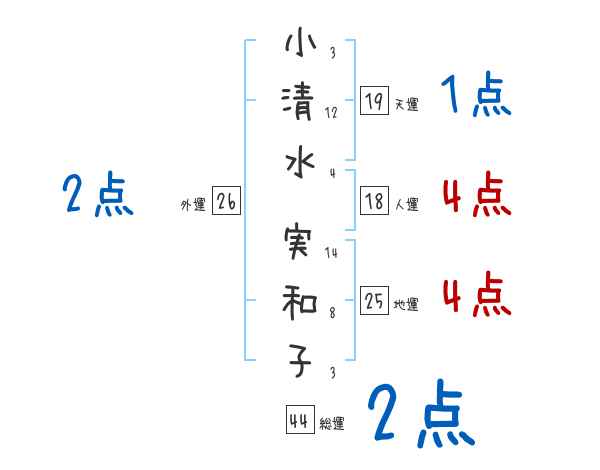外運![]() | 小清水実和子さんの外運は26画の2つ星!波瀾万丈かも。信頼できる人を大事にしましょう。 生活面を象徴する運勢です。外部から受ける影響力を表し、結婚運、家庭運や職場、環境への順応性を表します。 |
