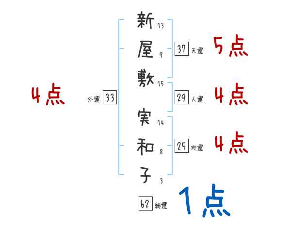 天運![]() | 新屋敷実和子さんの天運は37画の5つ星!努力家で順応性に優れる。現実的な考え方ができ忠実に物事をこなす。 家系が持つ宿命的な運勢を表します。祖先から受け継いだ苗字ですので自分の力が及びません。家柄を象徴します。 |