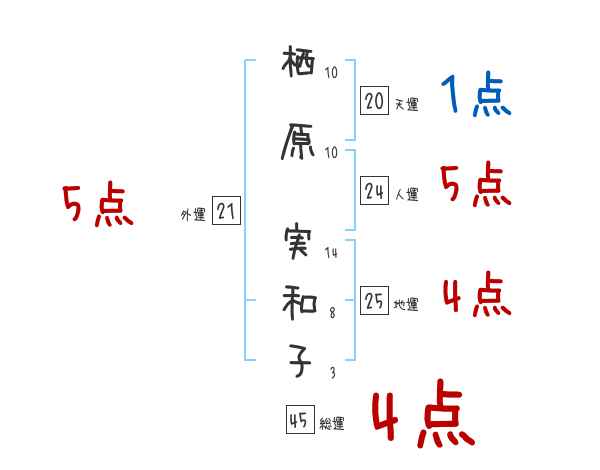 総運![]() | 栖原実和子さんの総運は45画の4つ星!もくもくと物事を進め達成する。地味な努力家。 あなたの人生を表す1番重要な運勢です。生涯を通じて影響する総合運となり、主に50歳以降の晩年期に影響を及ぼします。 |