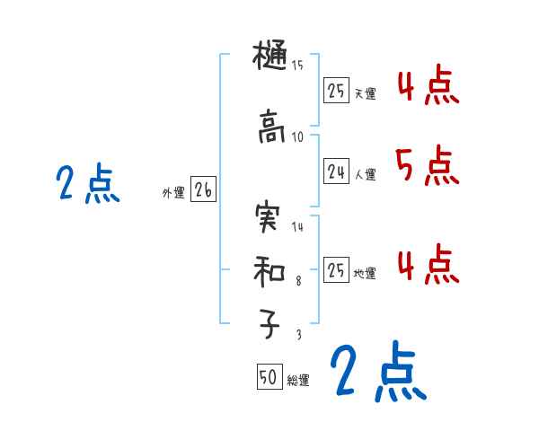 総運![]() | 樋高実和子さんの総運は50画の2つ星!浮き沈みが激しく不安定。しりすぼみに衰退しやすいので注意しましょう。 あなたの人生を表す1番重要な運勢です。生涯を通じて影響する総合運となり、主に50歳以降の晩年期に影響を及ぼします。 |