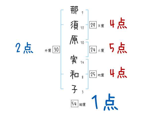 総運![]() | 那須原実和子さんの総運は54画の1つ星!トラブルが多いかも。周りをよく見て協調して過ごしましょう。 あなたの人生を表す1番重要な運勢です。生涯を通じて影響する総合運となり、主に50歳以降の晩年期に影響を及ぼします。 |