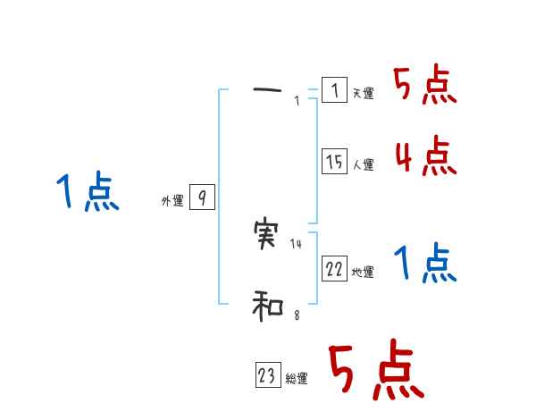 天運![]() | 一実和さんの天運は1画の5つ星!行動力、指導力があり出世し繁栄する。幸運に恵まれる。 家系が持つ宿命的な運勢を表します。祖先から受け継いだ苗字ですので自分の力が及びません。家柄を象徴します。 |