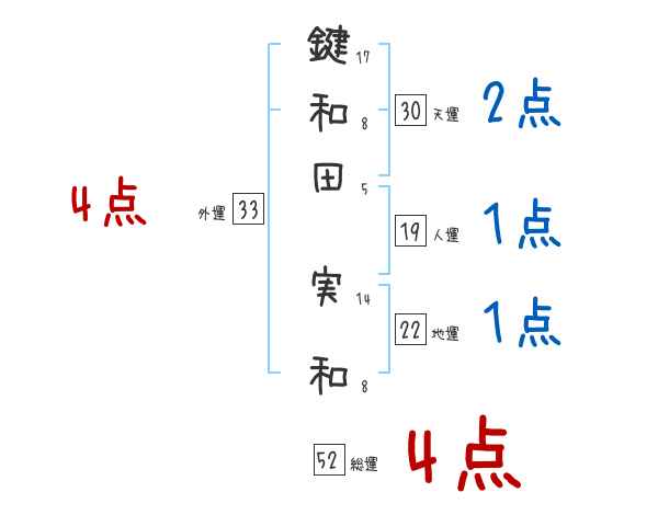 天運![]() | 鍵和田実和さんの天運は30画の2つ星!浮き沈みの激しさに注意しましょう。 家系が持つ宿命的な運勢を表します。祖先から受け継いだ苗字ですので自分の力が及びません。家柄を象徴します。 |