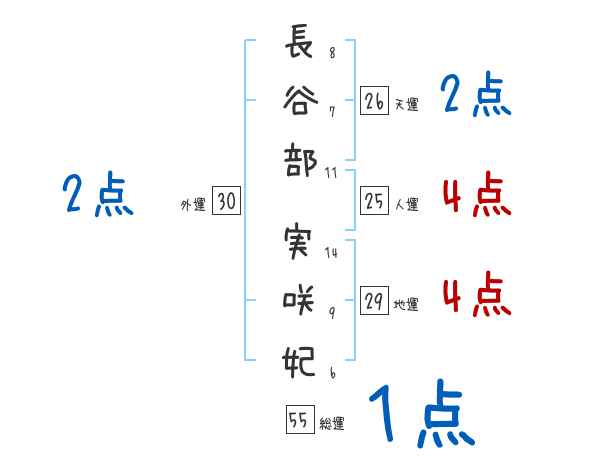 天運![]() | 長谷部実咲妃さんの天運は26画の2つ星!波瀾万丈かも。信頼できる人を大事にしましょう。 家系が持つ宿命的な運勢を表します。祖先から受け継いだ苗字ですので自分の力が及びません。家柄を象徴します。 |