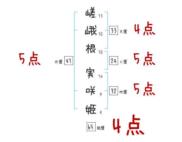 天運![]() | 嵯峨根実咲姫さんの天運は33画の4つ星!権力志向でプライドが高い。勇気があり運を切り開き成功する。 家系が持つ宿命的な運勢を表します。祖先から受け継いだ苗字ですので自分の力が及びません。家柄を象徴します。 |