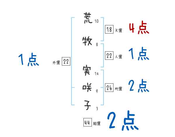 外運![]() | 荒牧実咲子さんの外運は22画の1つ星!努力することが苦手ないっぽう手先が器用。芸術性にも優れる。 生活面を象徴する運勢です。外部から受ける影響力を表し、結婚運、家庭運や職場、環境への順応性を表します。 |