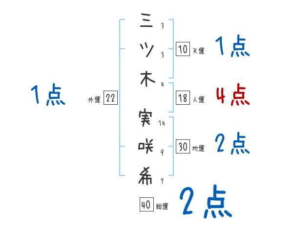 外運![]() | 三ツ木実咲希さんの外運は22画の1つ星!努力することが苦手ないっぽう手先が器用。芸術性にも優れる。 生活面を象徴する運勢です。外部から受ける影響力を表し、結婚運、家庭運や職場、環境への順応性を表します。 |