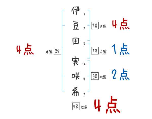 外運![]() | 伊豆田実咲希さんの外運は29画の4つ星!完全主義で才能がある。厳格な心の持ち主。 生活面を象徴する運勢です。外部から受ける影響力を表し、結婚運、家庭運や職場、環境への順応性を表します。 |
