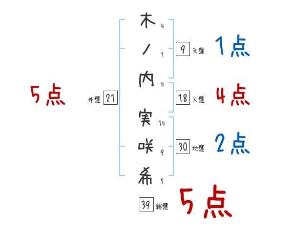 外運![]() | 木ノ内実咲希さんの外運は21画の5つ星!統率力がある。独立し成功する。名誉を手に入れる。 生活面を象徴する運勢です。外部から受ける影響力を表し、結婚運、家庭運や職場、環境への順応性を表します。 |